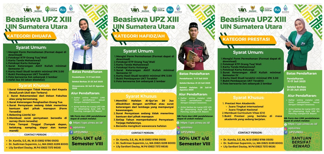 Unit Pengumpul Zakat (UPZ) UIN Sumatera Utara kembali membuka pendaftaran Beasiswa UPZ Tahap XIII untuk mahasiswa UIN Sumatera Utara dengan kategori Dhuafa, Hafidz/Ah, dan Prestasi.