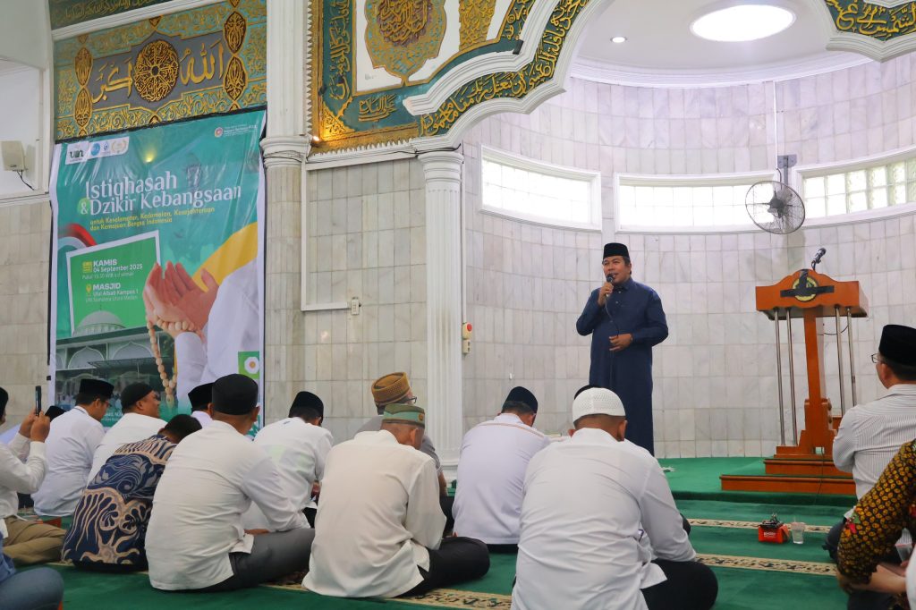 Dalam sambutannya, Rektor UINSU Prof. Dr. Nurhayati, M.Ag, menekankan pentingnya kegiatan istighasah dan zikir kebangsaan sebagai wadah doa bersama demi keselamatan, kesehatan, dan kemajuan bangsa. Ia menyampaikan harapan agar Indonesia tetap diberkahi kedamaian serta dijauhkan dari segala bentuk perpecahan. “Kita berdoa semoga negeri kita ini selalu aman, damai, dan rakyatnya diberi kesehatan serta keberkahan,” ujarnya.