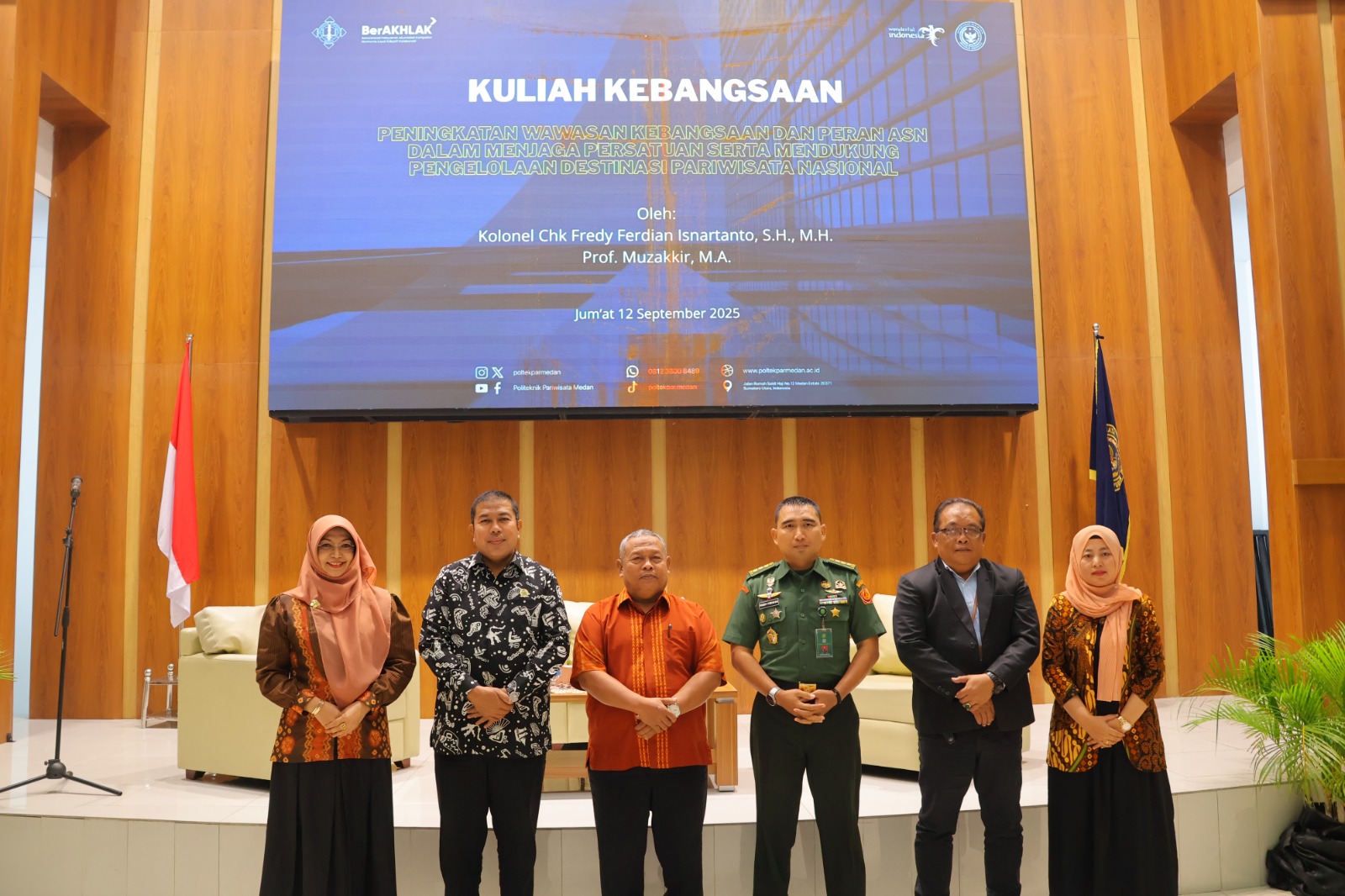 Politeknik Pariwisata Medan menggelar Kuliah Kebangsaan pada Jumat, 12 September 2025 di Auditorium Rektorat Baru, dengan menghadirkan dua narasumber utama yakni Kolonel Chk Fredy Ferdian Isnartanto, S.H., M.H. (Kepala Pengadilan Militer I-04 Palembang) dan Prof. Dr. Muzakkir, M.Ag. (Wakil Rektor Bidang Kerja Sama dan Pengembangan Lembaga UINSU Medan). Kegiatan ini merupakan salah satu realisasi dari kerja sama (MoU) antara UIN Sumatera Utara (UINSU) Medan dengan Politeknik Pariwisata Medan, yang bertujuan memperkuat wawasan kebangsaan serta mendorong pengelolaan destinasi pariwisata berkelanjutan.