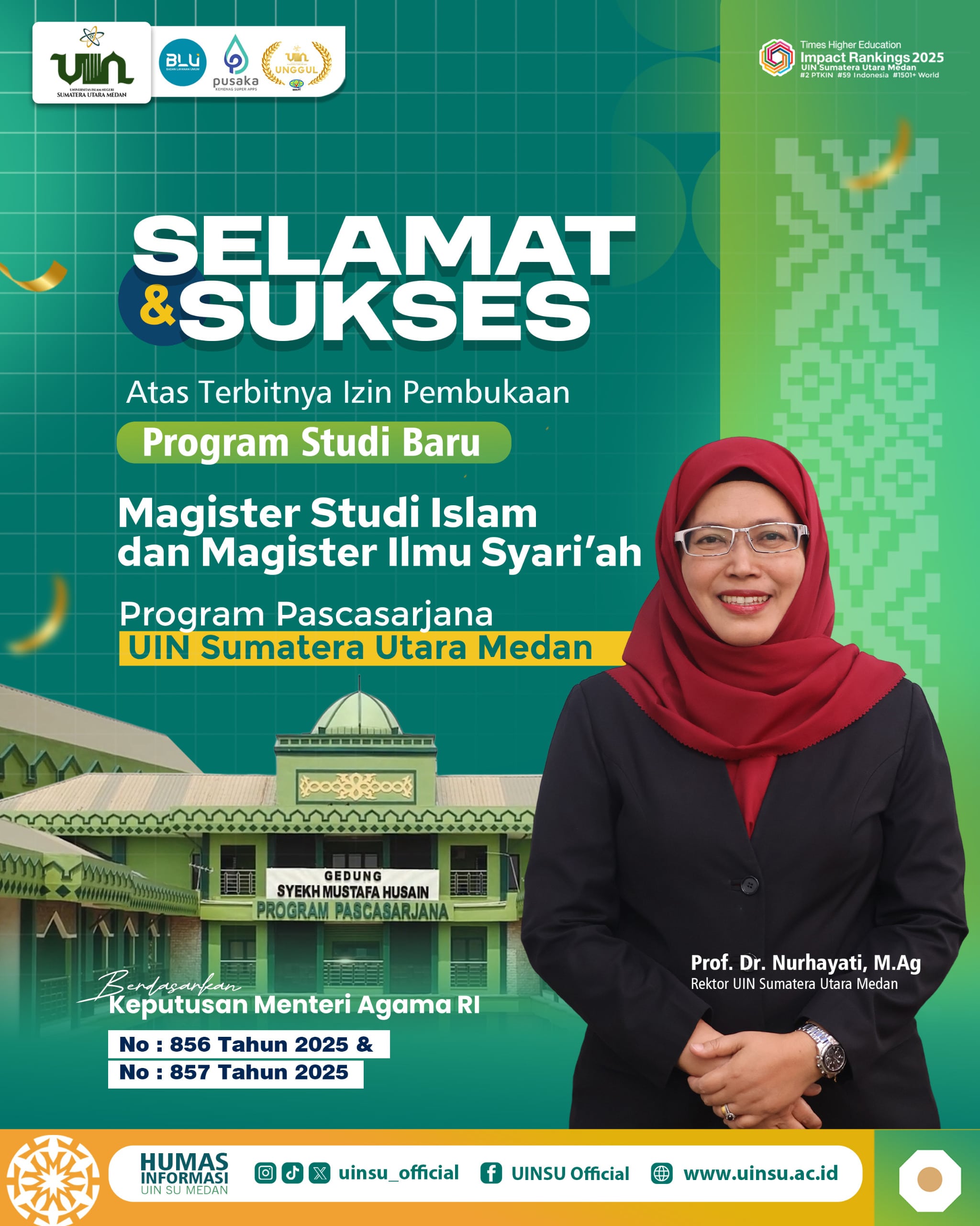 Universitas Islam Negeri Sumatera Utara (UINSU) Medan resmi memperoleh izin pembukaan dua Program Studi baru pada Program Pascasarjana, yakni Magister Studi Islam dan Magister Ilmu Syari’ah. Izin tersebut tertuang dalam Keputusan Menteri Agama Republik Indonesia Nomor 856 Tahun 2025 dan Nomor 857 Tahun 2025.