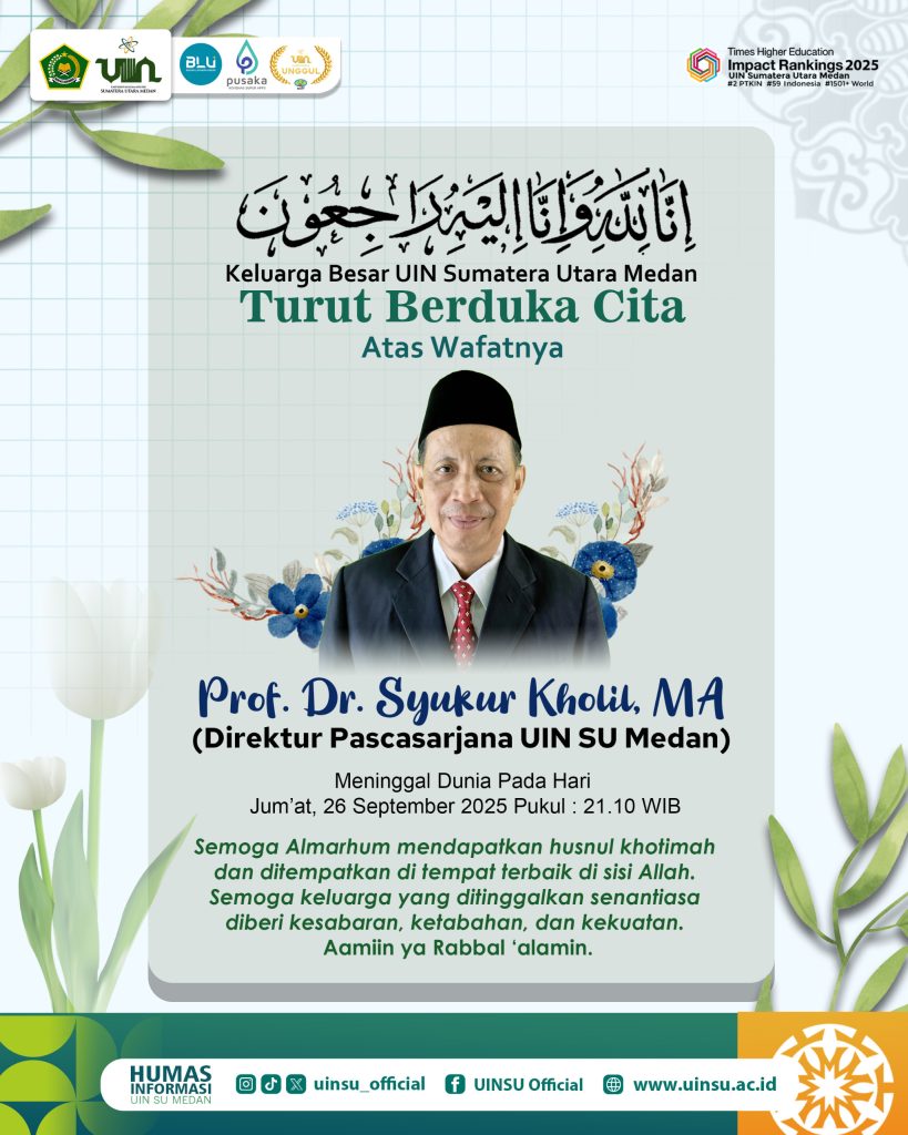 Innalillahi wa inna ilaihi raji’un. Keluarga besar Universitas Islam Negeri Sumatera Utara (UINSU) Medan berduka mendalam atas wafatnya Prof. Dr. Syukur Kholil, MA, Direktur Pascasarjana sekaligus Guru Besar Fakultas Dakwah dan Komunikasi. Beliau berpulang ke rahmatullah pada Jumat, 26 September 2025, pukul 21.10 WIB di RS Murni Teguh Medan.