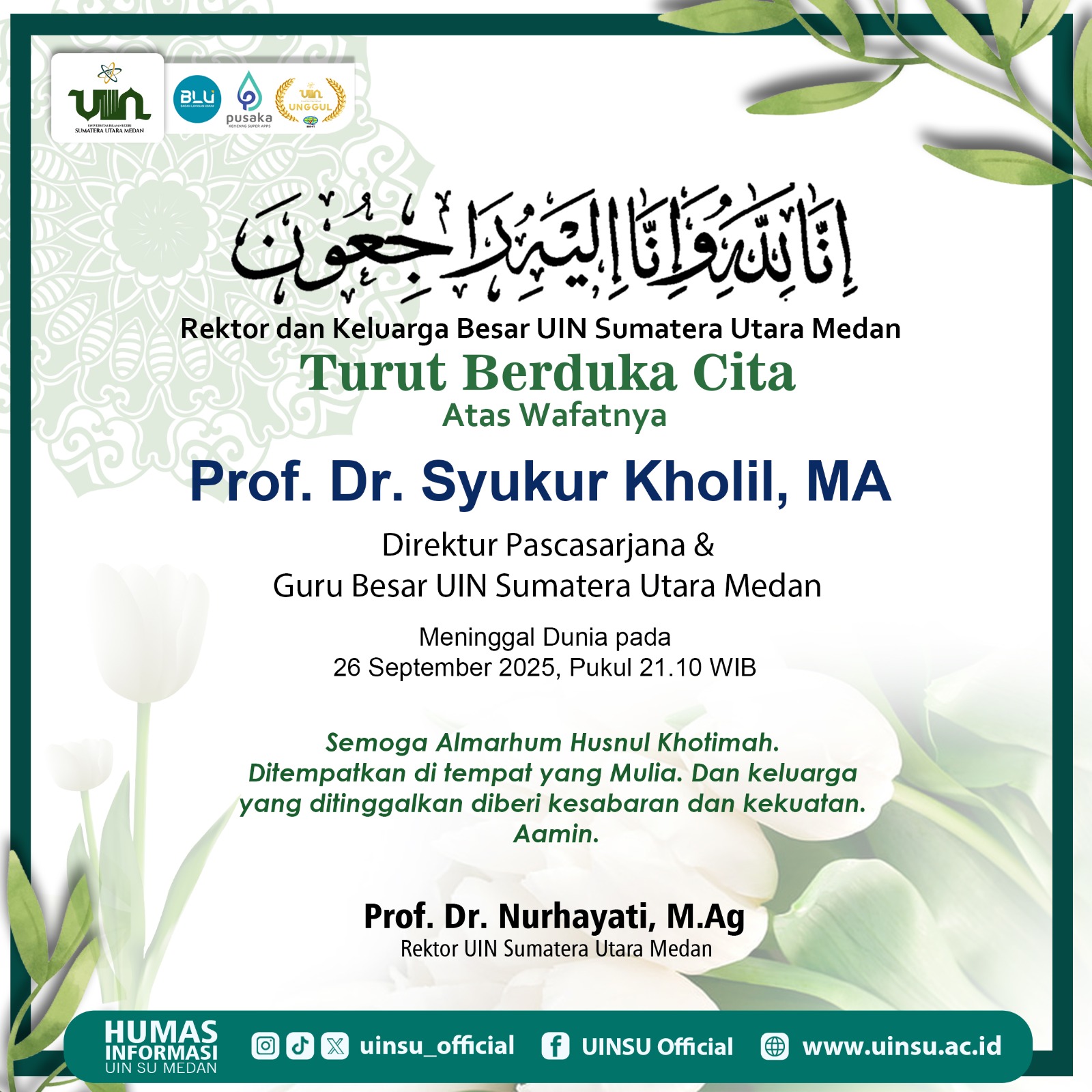 Innalillahi wa inna ilaihi raji’un. Keluarga besar Universitas Islam Negeri Sumatera Utara (UINSU) Medan berduka mendalam atas wafatnya Prof. Dr. Syukur Kholil, MA, Direktur Pascasarjana sekaligus Guru Besar Fakultas Dakwah dan Komunikasi. Beliau berpulang ke rahmatullah pada Jumat, 26 September 2025, pukul 21.10 WIB di RS Murni Teguh Medan.