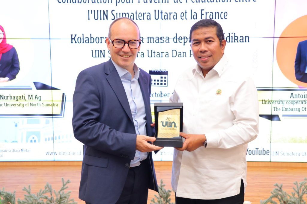 Sebelum sesi presentasi dimulai, dilakukan penyerahan plakat kenang-kenangan dari pihak UINSU kepada Antoine Bricout sebagai simbol apresiasi atas kunjungan tersebut. Acara kemudian juga diselingi dengan foto bersama antara pimpinan universitas, perwakilan IFI dan Campus France, serta seluruh peserta sosialisasi.