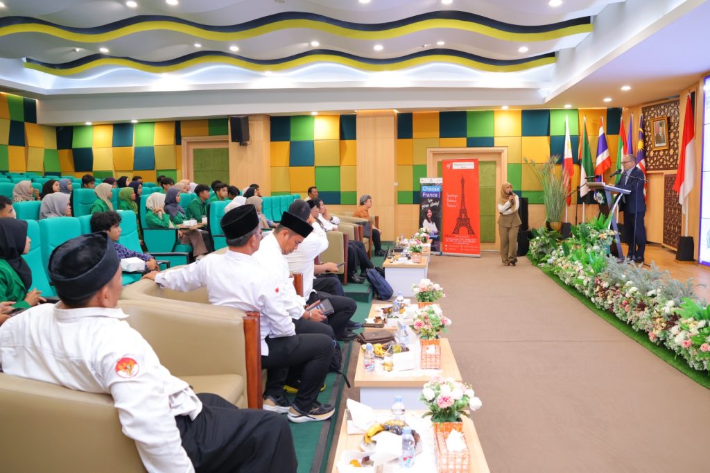 Dalam presentasinya, Antoine Bricout menyoroti eratnya hubungan diplomatik antara Indonesia dan Prancis yang kini telah memasuki usia ke-75 tahun. Ia menekankan bahwa kerja sama kedua negara tidak hanya berlangsung antar pemerintah, tetapi juga antar masyarakat dan lembaga pendidikan. “France and Indonesia have never been so close — this is the best time to strengthen our academic connection,” ujarnya dalam bahasa Inggris. Ia menjelaskan berbagai peluang studi di Prancis serta keunggulan sistem pendidikan tinggi yang berstandar internasional namun terjangkau, karena sebagian besar institusinya disubsidi oleh pemerintah.