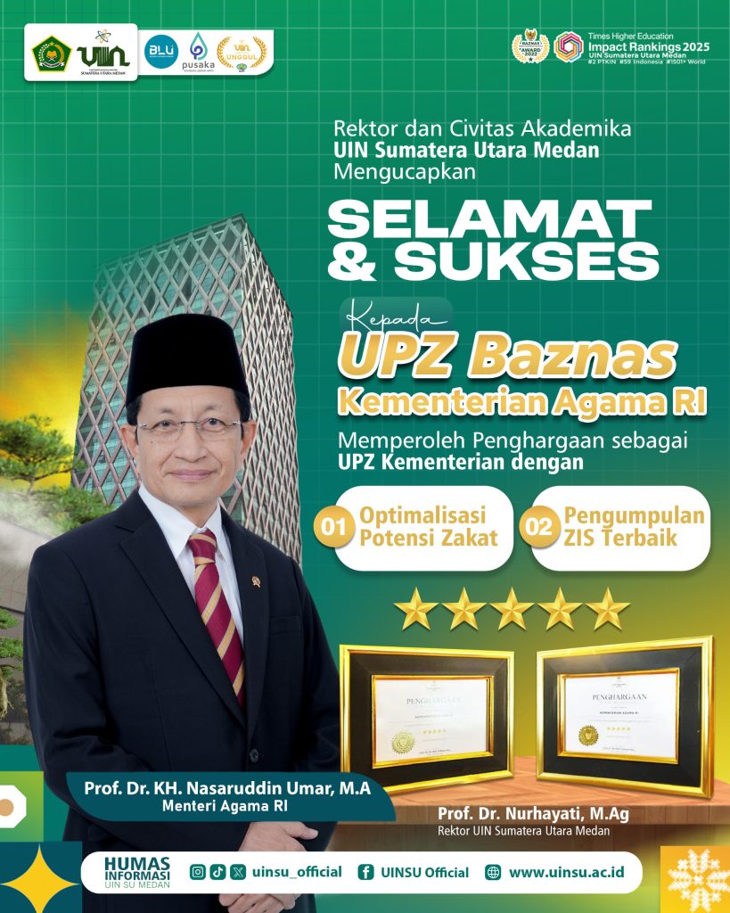 Rektor Universitas Islam Negeri Sumatera Utara (UINSU), Prof. Dr. Nurhayati, M.Ag., menyampaikan apresiasi atas prestasi Unit Pengumpul Zakat (UPZ) Kementerian Agama RI — unit resmi binaan BAZNAS — yang meraih dua penghargaan pada ajang UPZ Award 2025, yakni “UPZ Kementerian dengan Optimalisasi Potensi Zakat” dan “UPZ Kementerian dengan Pengumpulan ZIS Terbaik.” Ucapan selamat tersebut disampaikan melalui kanal resmi UINSU di media sosial, menegaskan dukungan kampus terhadap penguatan ekosistem zakat nasional dan teladan pengelolaan ZIS di lingkungan kementerian.