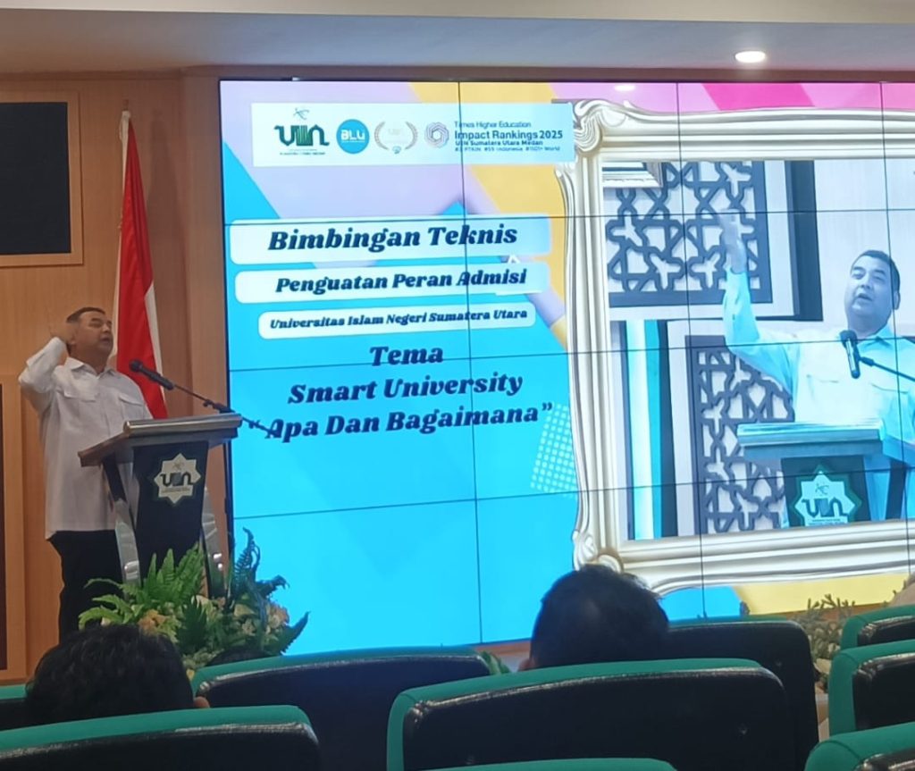 Selasa, 14 Oktober 2025 – Universitas Islam Negeri Sumatera Utara (UIN SU) Medan menyelenggarakan kegiatan Bimbingan Teknis (Bimtek) Penguatan Peran Admisi dengan tema “Smart University: Apa dan Bagaimana”, yang berlangsung di Aula Lantai 3 Gedung Biro Rektor Kampus IV UIN SU, Tuntungan. Kegiatan ini menjadi langkah penting dalam memperkuat peran admisi dalam mendukung visi universitas menuju kampus yang cerdas, modern, dan berdaya saing global.