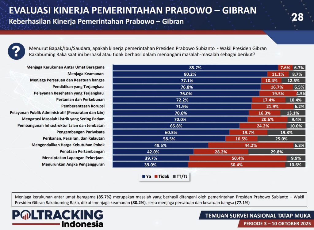 Survei nasional bertajuk “Evaluasi Satu Tahun Kinerja Pemerintahan Prabowo–Gibran” yang dirilis Poltracking Indonesia pada Minggu (19/10/2025) menempatkan Kementerian Agama sebagai lembaga dengan kinerja terbaik di tingkat kementerian. Survei ini dilakukan secara tatap muka pada 3–10 Oktober 2025 terhadap 1.220 responden di seluruh Indonesia menggunakan metode multistage random sampling dengan margin of error ±2,9% dan tingkat kepercayaan 95%. Direktur Eksekutif Poltracking Indonesia, Hanta Yuda AR, menjelaskan bahwa publik menilai Kementerian Agama di bawah kepemimpinan Nasaruddin Umar berhasil menunjukkan kinerja profesional, komunikatif, dan berdampak nyata, menempatkannya di posisi teratas pejabat setingkat menteri dengan apresiasi kinerja tertinggi.