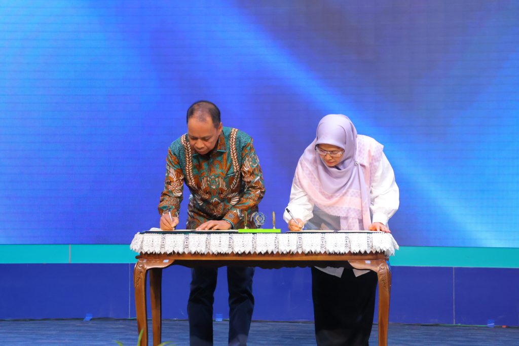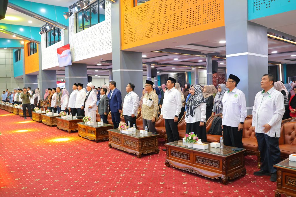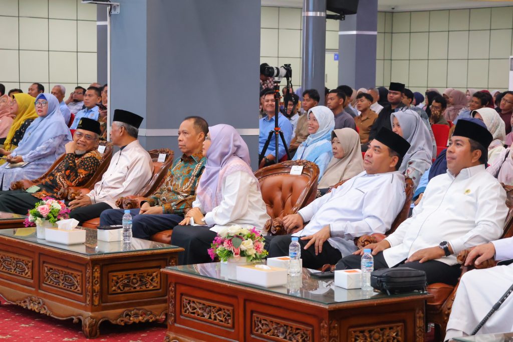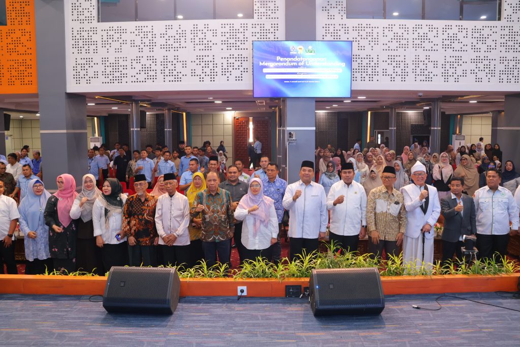Sementara itu, dari pihak UMSU, turut hadir Rektor Prof. Dr. Agussani, M.AP., bersama para wakil rektor — Prof. Dr. Muhammad Arifin, S.H., M.Hum. (WR I), Prof. Dr. Akrim, M.Pd. (WR II), dan Assoc. Prof. Dr. Rudianto, S.Sos., M.Si. (WR III) — para jajaran BPH serta jajaran dekan, pimpinan lembaga, dosen, dan ratusan mahasiswa yang memenuhi ruangan.