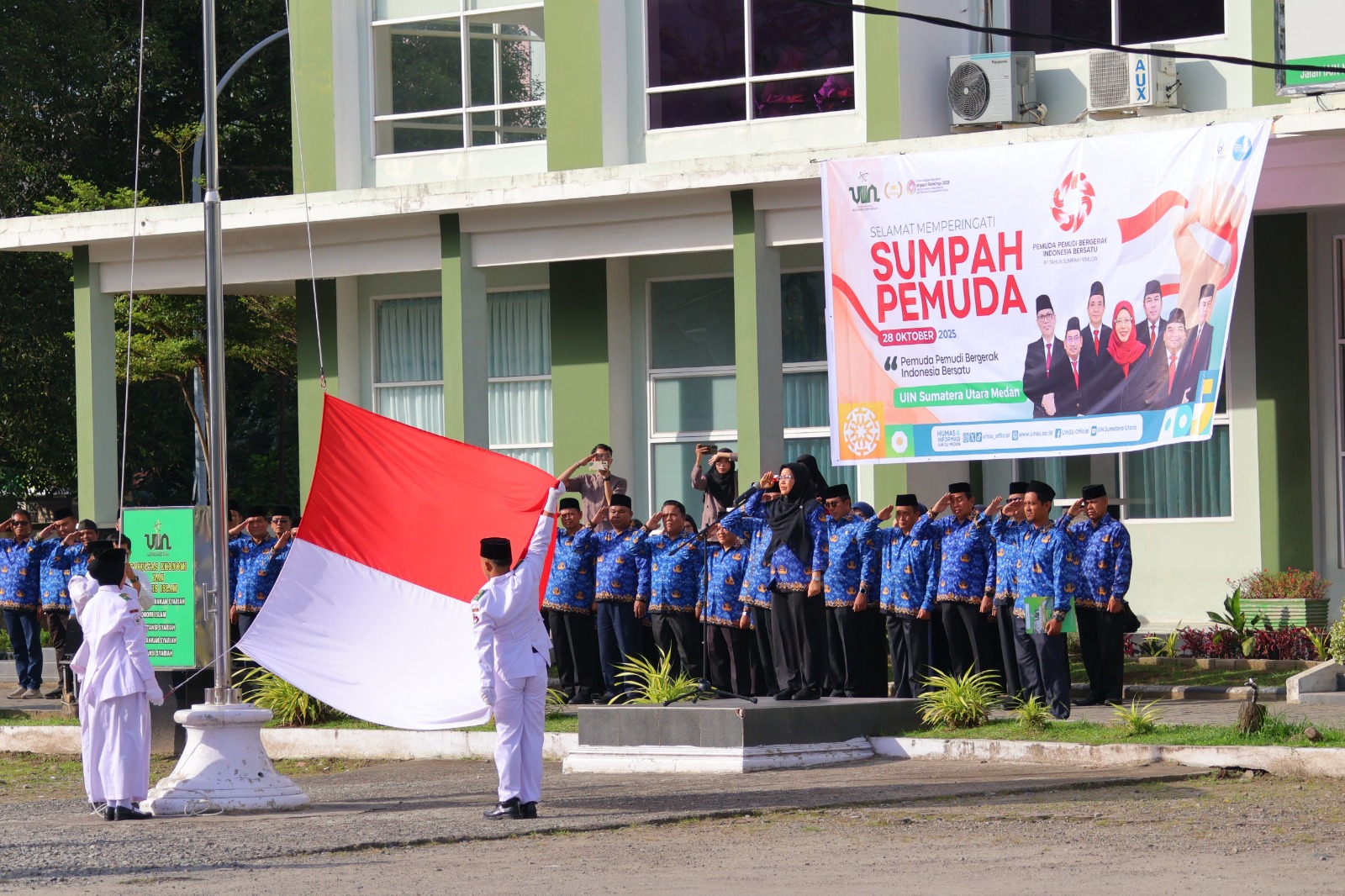 Upacara berlangsung dengan khidmat, diawali dengan pengibaran bendera merah putih oleh Paskibra UINSU dan diiringi lagu kebangsaan “Indonesia Raya” yang dibawakan Paduan Suara UINSU. Pembacaan teks Pembukaan UUD 1945, Teks Keputusan Kongres Pemuda Indonesia 1928 dilakukan secara berurutan oleh para petugas yang telah ditugaskan melalui Surat Tugas Rektor Nomor B-1461/Un.11.R/B.I.3/KP.01.1/10/2025.