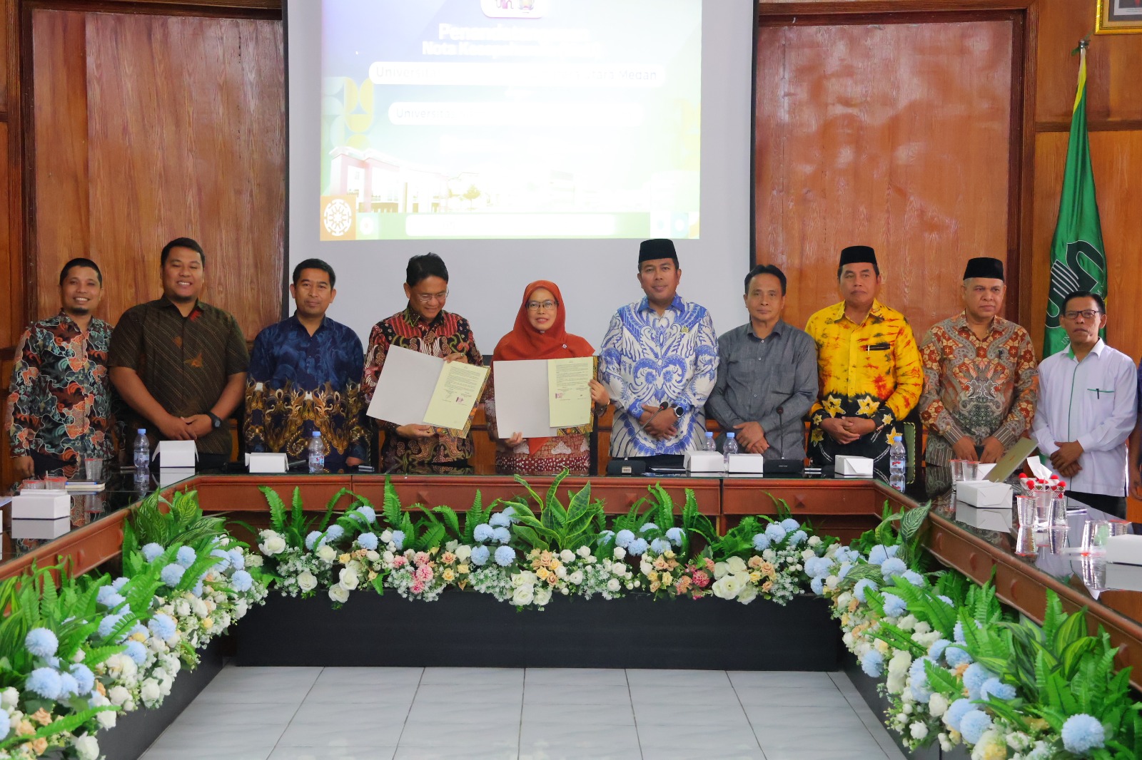 Acara tersebut dihadiri oleh jajaran pimpinan dari kedua universitas. Dari pihak UINSU hadir Rektor Prof. Dr. Nurhayati, M.Ag., didampingi Wakil Rektor Bidang Kemahasiswaan Prof. Dr. Katimin, M.A., Wakil Rektor Bidang Kerja Sama dan Pengembangan Lembaga Prof. Dr. Muzakkir, M.Ag., Kepala Biro AAKK Dr. Tohar Bayoangin, para dekan dan wakil dekan, kepala perpustakaan, serta staf biro rektor lainnya. Sementara dari UNUSU hadir Rektor Dr. Ibnu Affan, S.H., M.Hum., bersama para wakil rektor, ketua lembaga, sejumlah dekan, kaprodi, dan staf lainnya.