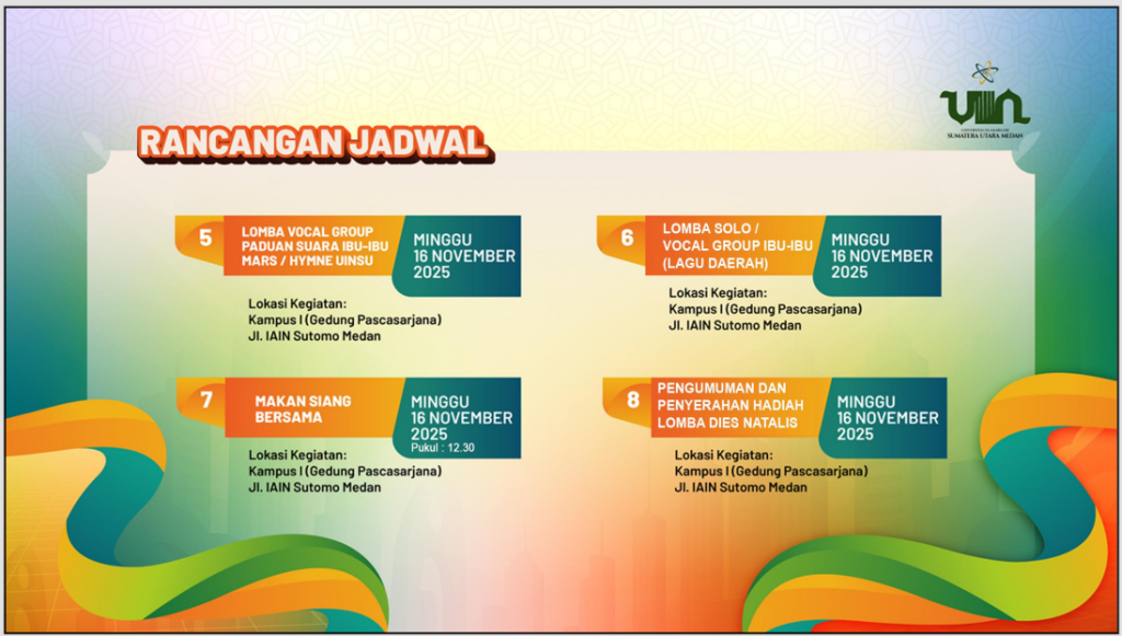 Semarak acara semakin terasa dengan berbagai lomba-lomba kreatif yang diperuntukkan bagi seluruh unsur kampus. Mulai dari lomba memasak, lomba vocal solo lagu daerah, hingga vocal group mars UINSU Medan yang memeriahkan suasana. Kegiatan ini bukan hanya hiburan, tetapi juga wadah untuk menumbuhkan semangat kebersamaan dan kreativitas di lingkungan akademik UINSU.