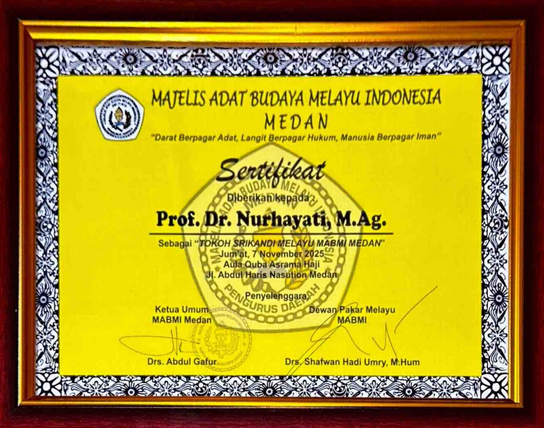 Jum’at, 7 November 2025 — Dalam suasana penuh keakraban dan khidmat, Rektor Universitas Islam Negeri Sumatera Utara (UINSU), Prof. Dr. Nurhayati, M.Ag., menerima penghargaan sebagai Tokoh Srikandi Melayu dari Majelis Adat Budaya Melayu Indonesia (MABMI) Kota Medan. Penganugerahan tersebut diberikan dalam acara Silaturahmi dan Kajian Kebangsaan di Gedung Asrama Haji Medan.