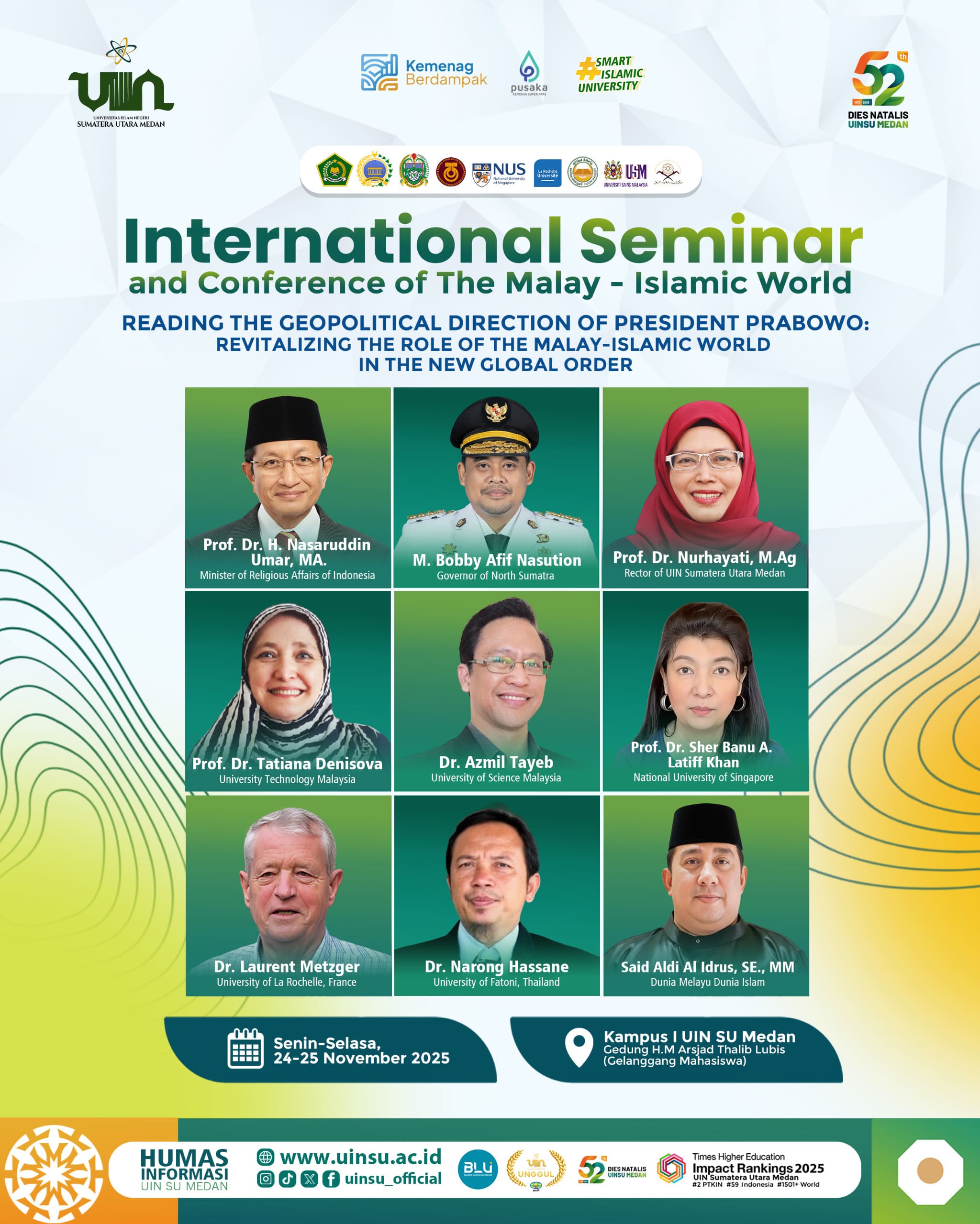 Ahad, 23 November 2025 — Universitas Islam Negeri Sumatera Utara (UINSU) Medan bersiap menyelenggarakan International Seminar and Conference of The Malay–Islamic World yang akan berlangsung selama dua hari pada 24–25 November 2025 di Kampus I UINSU, Gedung H.M. Arsjad Thalib Lubis. Seminar internasional ini mengangkat tema besar “Reading the Geopolitical Direction of President Prabowo: Revitalizing the Role of the Malay-Islamic World in the New Global Order.” Acara ini digelar sebagai forum ilmiah untuk membaca arah geopolitik Indonesia di bawah kepemimpinan Presiden Prabowo Subianto, sekaligus merumuskan ulang peran strategis dunia Melayu-Islam dalam percaturan global.