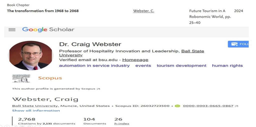 Salah satu sitasi berasal dari Professor Craig Webster, pakar Hospitality Innovation and Leadership dari Ball State University, USA. Beliau mengutip penelitian dosen UINSU dalam karyanya berjudul “The Transformation from 1968 to 2068” yang dimuat dalam Book Chapter Future Tourism in A Robonomic World (2024).