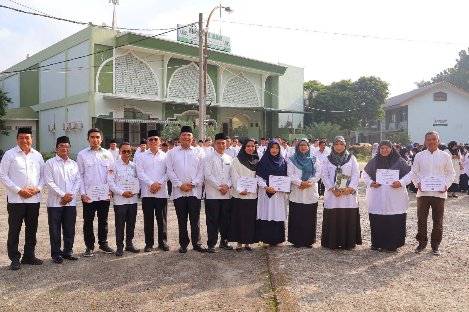 Penyerahan dilakukan secara simbolis oleh Rektor UINSU Medan, Prof. Dr. Nurhayati, M.Ag., didampingi Ketua Bansos UINSU, Dr. Mardinal Tarigan, M.A., seusai apel pagi di Kampus I UINSU Medan. Dalam kegiatan ini, Rektor menyerahkan santunan kepada beberapa perwakilan pegawai terdampak, sementara seluruh penerima lainnya menerima bantuan melalui rekening remunerasi masing-masing.