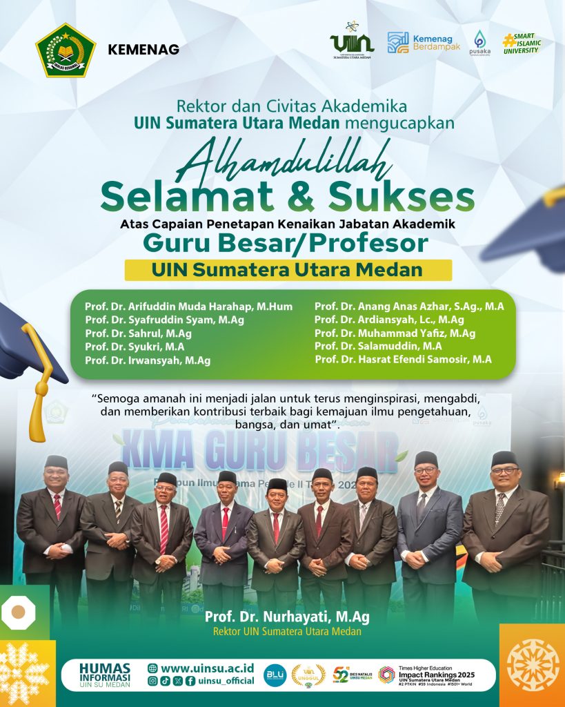 Rektor Universitas Islam Negeri Sumatera Utara (UINSU) Medan, Prof. Dr. Nurhayati, M.Ag, menyampaikan ucapan selamat dan sukses kepada para dosen UINSU Medan yang telah resmi menerima Surat Keputusan Menteri Agama (KMA) Kenaikan Jabatan Akademik Guru Besar/Profesor.