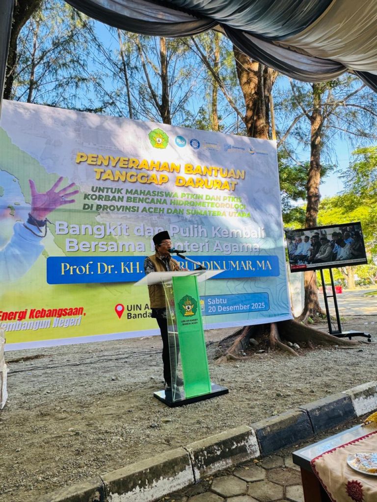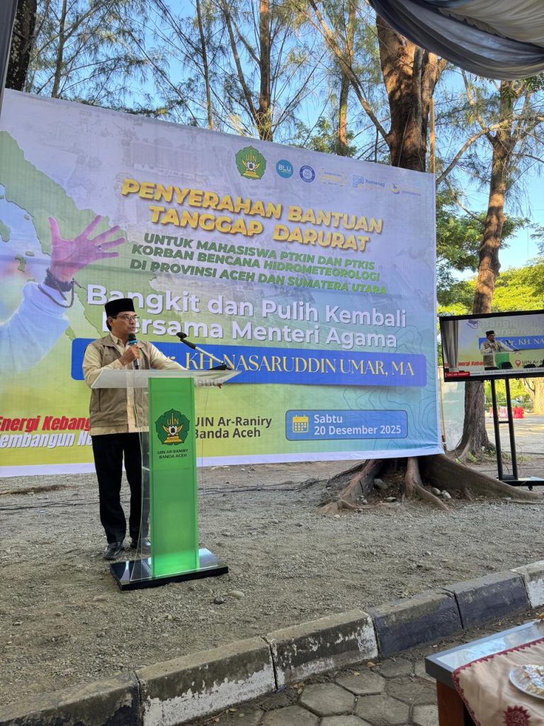 Penyerahan bantuan tersebut berlangsung di kampus UIN Ar-Raniry, Banda Aceh, Sabtu (20/12/2025), dalam agenda bertajuk Penyerahan Bantuan Tanggap Darurat untuk Mahasiswa PTKIN dan PTKIS Korban Bencana Hidrometeorologi. Program ini merupakan bagian dari total penyaluran bantuan senilai Rp2,35 miliar yang menyasar ribuan mahasiswa terdampak di dua provinsi.