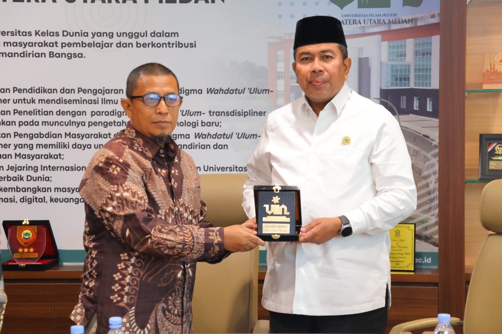 Prof. Muzakkir juga memperkenalkan para pimpinan fakultas dan pejabat struktural yang hadir, seraya menyoroti capaian UINSU yang terus berkembang. Ia menuturkan bahwa UINSU kini memiliki lebih dari 30.000 mahasiswa, delapan fakultas, dan satu program pascasarjana, dengan capaian akreditasi unggul dari BAN-PT serta terpilih menjadi satu dari dua Perguruan Tinggi Keagamaan Islam Negeri (PTKIN) yang masuk dalam Times Higher Education Impact Ranking 2025. “Ini bukti nyata bahwa UINSU terus berbenah menjadi universitas kelas dunia,” ujarnya dengan penuh semangat dalam sambutannya.