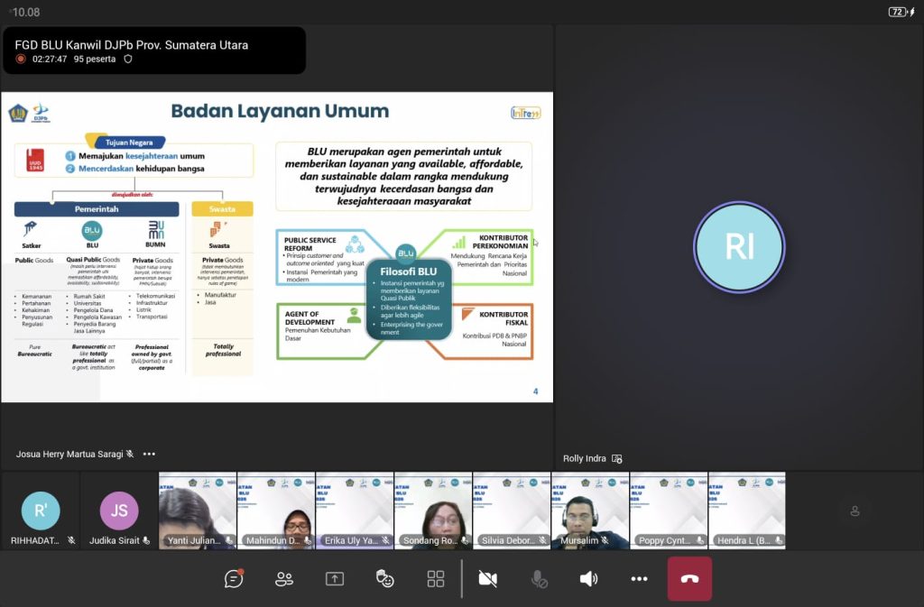 Kegiatan FGD tersebut dilaksanakan secara daring melalui Zoom Meeting pada Rabu, 21 Januari 2026, dan diikuti oleh para pengelola serta perwakilan Satker BLU di wilayah Provinsi Sumatera Utara. Forum ini menjadi sarana evaluasi dan penguatan kinerja BLU, khususnya dalam rangka peningkatan tata kelola, kinerja keuangan, kualitas layanan, serta keberlanjutan peran BLU dalam mendukung pelayanan publik.