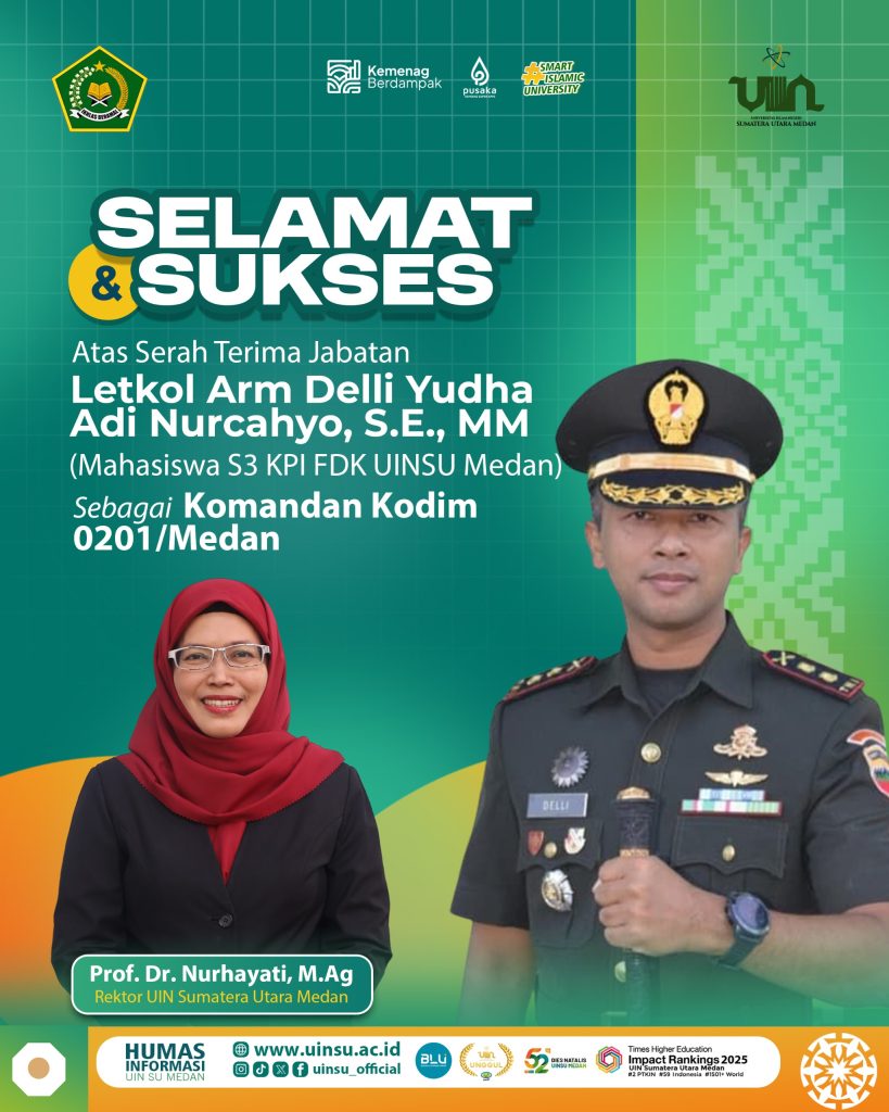 Dalam sambutannya, Letkol Arm Delli Yudha Adi Nurcahyo menyampaikan apresiasi atas kehadiran berbagai pihak, termasuk UINSU Medan. Ia juga mengungkapkan kebanggaannya karena saat ini tengah menempuh pendidikan di Program Studi S3 Komunikasi dan Penyiaran Islam, Fakultas Dakwah dan Komunikasi UINSU Medan. Hal ini menjadi kebanggaan tersendiri bagi UINSU Medan, karena dipercaya menjadi tempat menimba ilmu bagi seorang pemimpin militer aktif.
